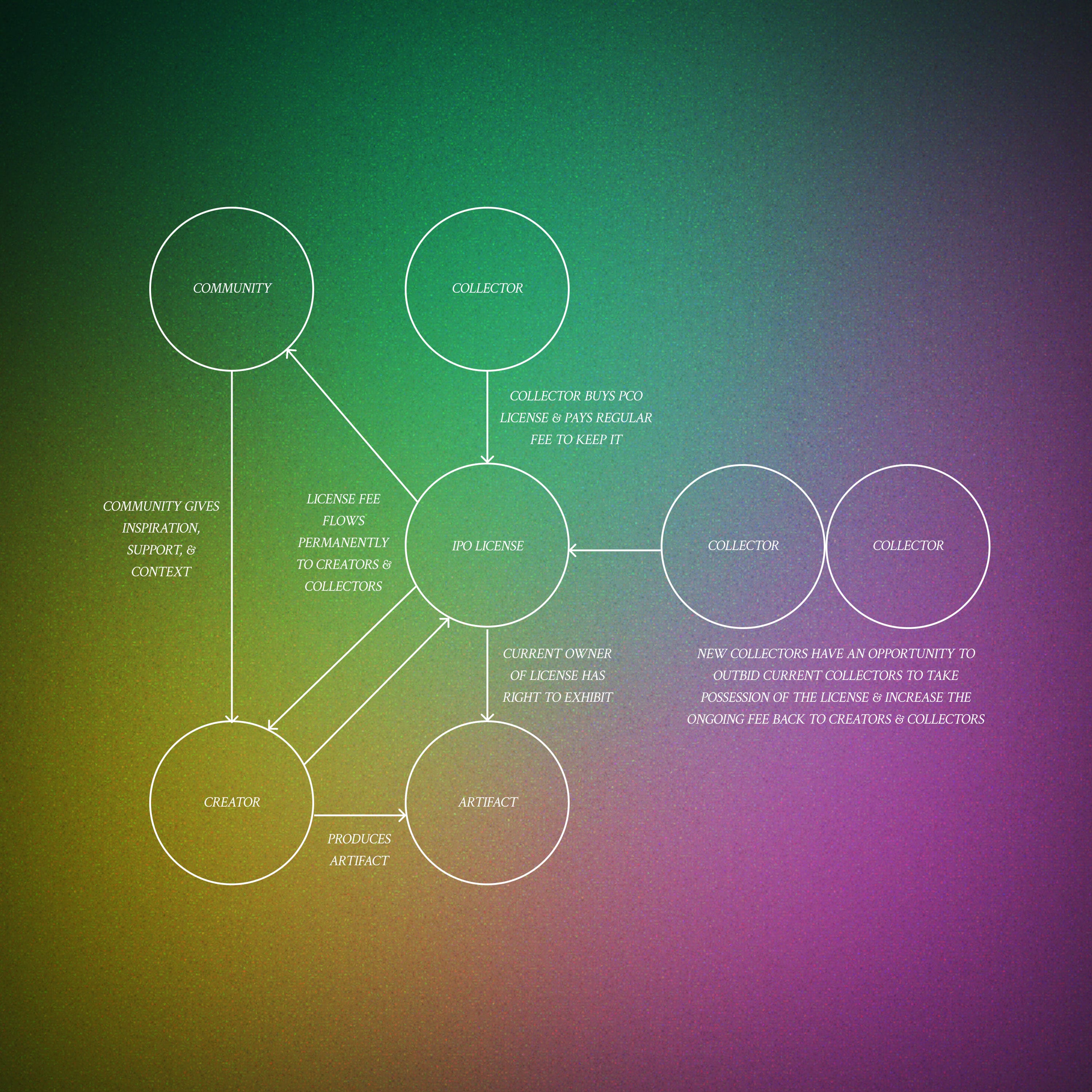 The artifact is also minted and exists autonomously. For simplicity in this discussion, let’s assume that the artifact is a one-of-one. So, in this scenario, the artifact is minted, and there is just one of them. The stewardship over this artifact is held by the collectors in the form of a license. This license represents the transactional exchange between the creators and the collectors; the collectors pay, and the resulting value flows to the creators. What the collectors receive in return is the license, which grants them rights to possess, exhibit, and possibly other utilities.