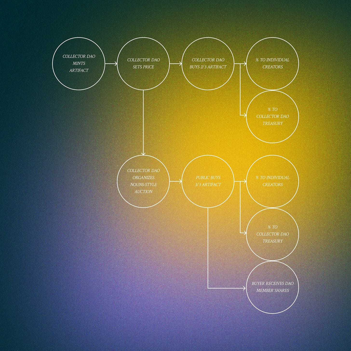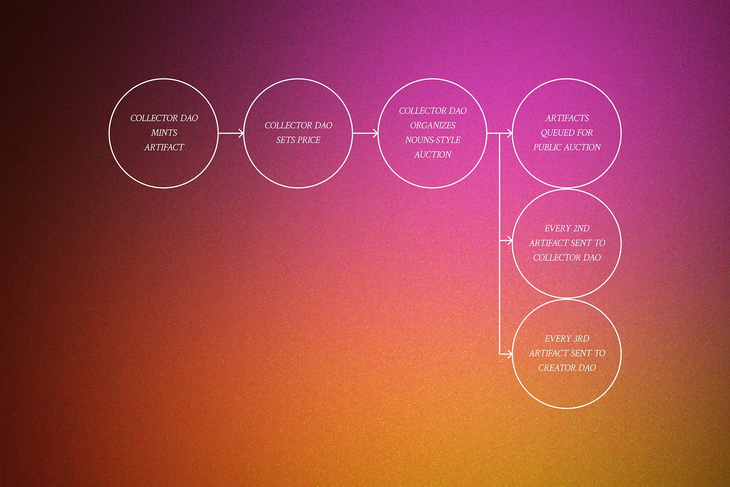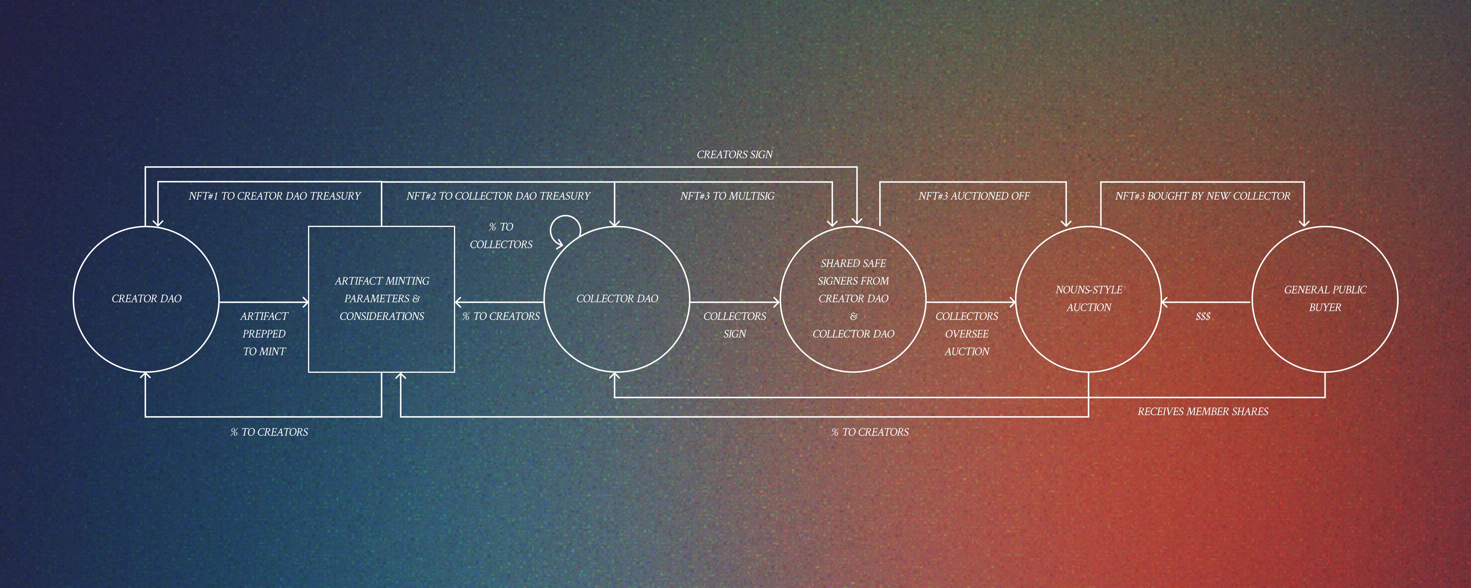 The key difference here is not having multiples of one artifact, but ensuring each artifact is unique. In the bootstrapping phase, the first artifact still goes to the Creator DAO, the second to the Collector DAO, and the third is auctioned publicly to facilitate onboarding. Then, in a manner similar to a Nouns DAO style, periodically, one artifact returns to the Collector DAO as a store of value, providing financial and governance rewards.