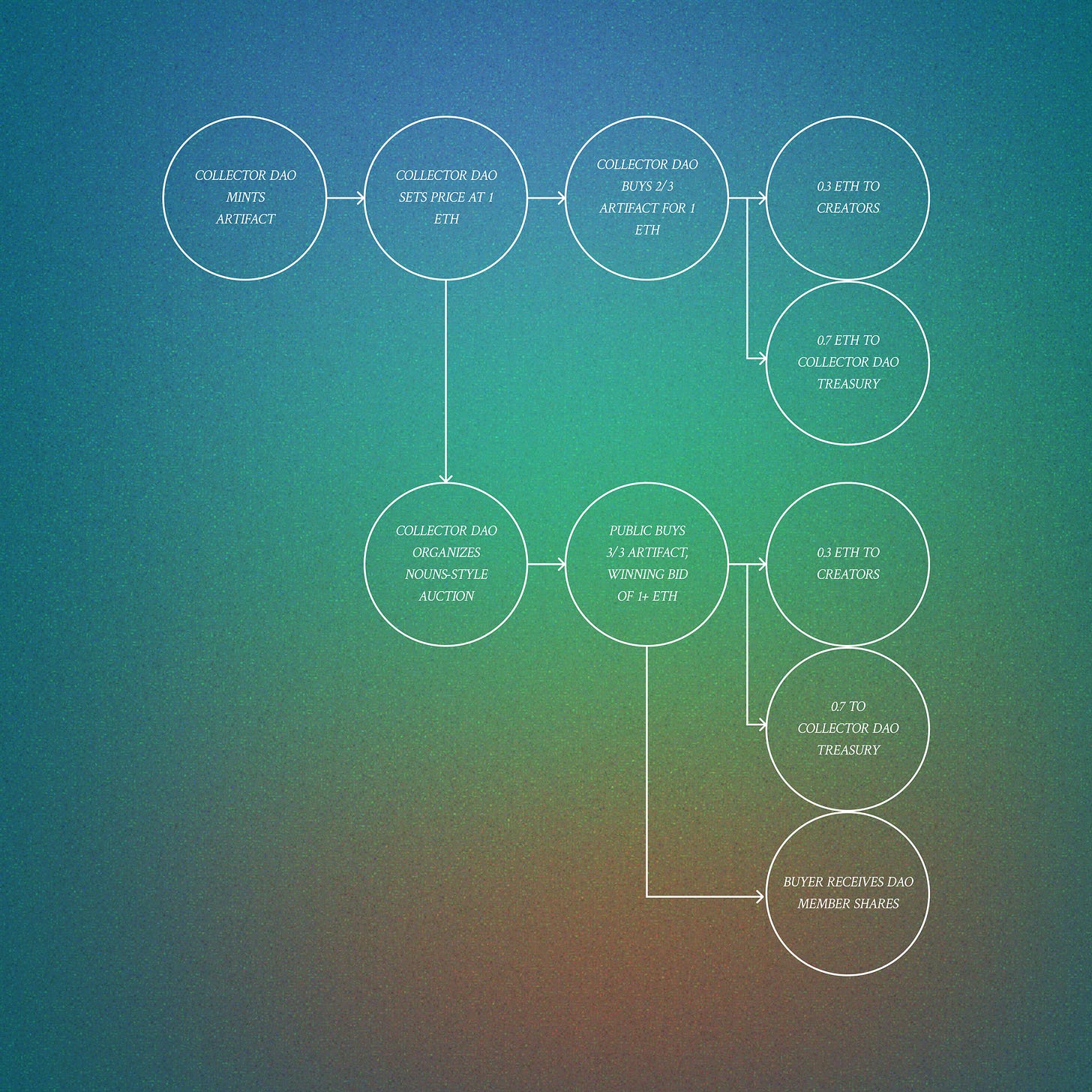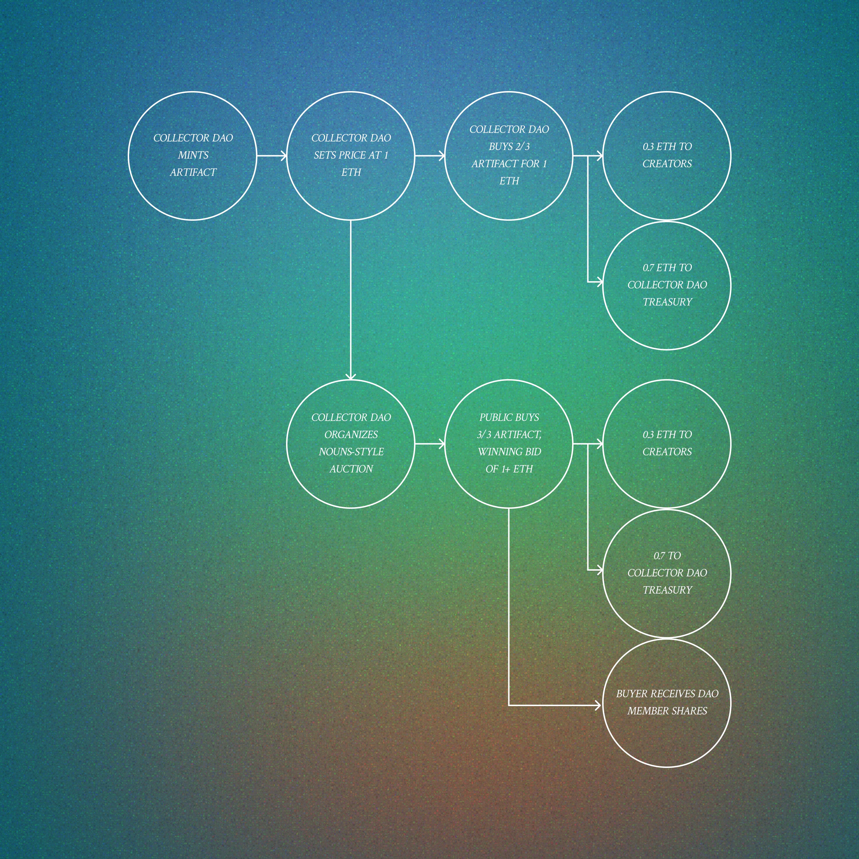 When the auction closes, and the sale is formalized, 30% of the proceeds go back to the original contributors. Assuming the auction price is the same as what the Collector DAO paid, 1 ETH, we would see 0.3 ETH returning to the Creators and 0.7 ETH going into the Collector DAO’s treasury. Additionally, the buyer receives the third artifact and pays 1 ETH. They receive shares in the Collector DAO, giving them a ragequit-eligible position in the DAO’s treasury, which now includes the 1.4 ETH, 0.7 of which came from their wallet.