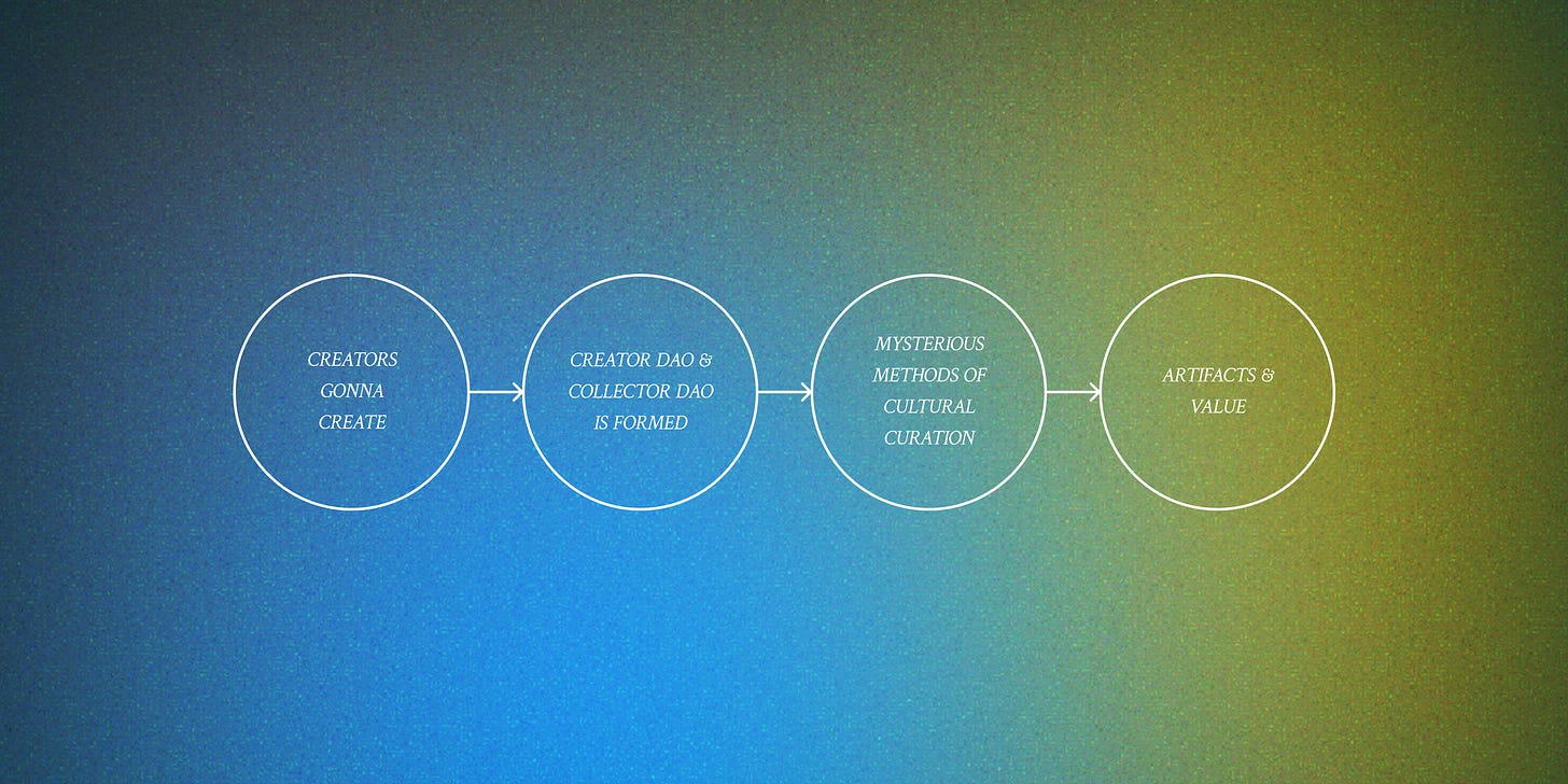 The intent here is to establish some constraints on the supply of the artifact and the influx of new members and capital. We can imagine this as a kind of culturally regulated bonding curve. This is designed to allow collectors and creators to determine the community’s growth pace and scale through their reciprocal interaction. It forces the creators to demonstrate the cultural value they can offer and compels the collectors to show their dedication towards stewarding those artifacts, thereby aligning with that cultural value. The goal is to prioritize cultural value over economic concerns, yet also allowing for real financial upside for all members.