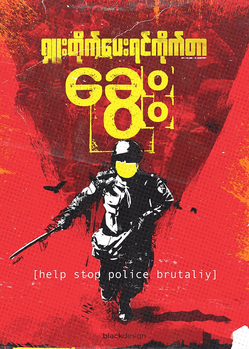 A graphic designer in that scene designed posters that he wanted to get out of Myanmar to fundraise and gather awareness. His original idea was to print the posters in Myanmar and then mail them out, but there was no fucking way that was going to work. The likelihood of them ever making it out of Myanmar — because of the scrutiny of the mail system and the chaos of COVID — was very low. We had money in the shared account attached to the compilation, so I suggested we buy the JPEGs and put them up on Bandcamp as prints. As we sold the prints they became a rolling income for the people on street level. There was another artist I was working with that wanted me to sell her performance art photography in the way she typically sold to museums, and I was like, Oh, I’m sorry, that’s not my world. It was very unlikely that I would be able to sell one of her photographs for a couple grand, but if we made them smaller she could have a rolling income, so I offered her that. The way that we’ve been working is very decentralized and rhizomatic. The art world gallery system doesn’t work for these purposes.