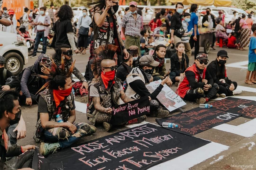 In the Signal group, none of us were using our real names. I told the professor that I would continue sending money to support these efforts, but I couldn’t be a part of that conversation anymore. I realized that my ability to gauge safety is more loose than many people, but I have a kid and I needed to be aware of her safety and well-being. There is also a punk rock band called The Rebel Riot, that has two tracks on the second compilation that we put out. The lead singer, Kyaw Kyaw, is a very vocal and visually available person. He has a Swiss girlfriend and there is some level of protection there, or he just doesn’t care, because he’s so adamant about his position. He runs the Food Not Bombs in Yangon and another large percentage of the money generated from the compilation goes to him through his girlfriend’s Swiss bank account. They spread it out through the community of punks and anarchists. That kind of trust is different. We know each other and I understand what he’s doing and he understands why I’m helping. It’s embodied trust.