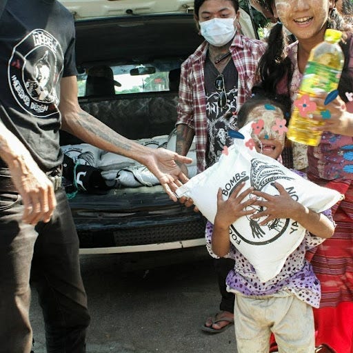 Let me explain. The graphic designer I mentioned earlier contacted me on Signal one night. You know when you can feel emotion in a text message when a situation is really intense? He was telling me he was in really big trouble and needed help. There was some fighting with police or military officers in the street and now they were being pursued. They didn’t take the license plates off of the car that they escaped in, so he was worried that they were gonna find him. He also has kids; he’s a parent, and I could definitely feel his stress. I contacted the professor and told him I had some friends who were in really big trouble and needed help forming a safe house outside of Yangon. They needed $300–500 to procure a car, food and medical supplies, and secure some sort of shelter that nobody knew about. This is where the trust gets really deep. The graphic designer was contacting me, because I’m the only person he could think of who could potentially help him in this situation. I contacted the professor, who said he thought he could get it to my friend within 24 hours. Whatever clandestine channels that dude has got on the ground were able to deliver the physical cash to this person without a bank account.
