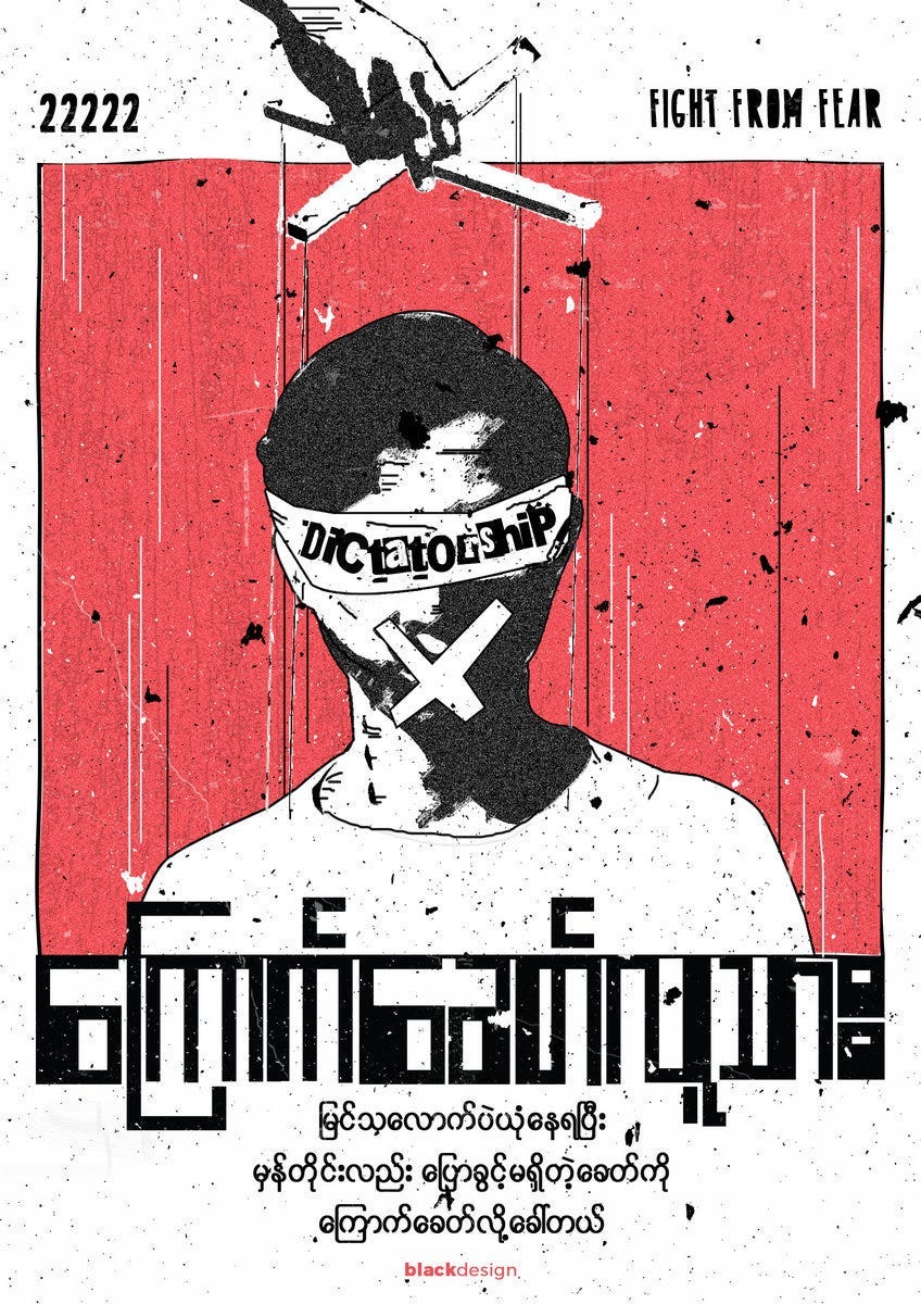 In February, I started seeing some of my friends from Myanmar posting videos of protests, mostly in Yangon, because that’s where most of them live. I had heard about the election in December. It’s not surprising that Aung San Suu Kyi’s party would win the election, because who would vote for fascism? The military decided that the election was fraudulent, taking a cue from what Trump had done with the US election that same year, with the difference being that, as a political entity, they still controlled the military. They are the military. Aung San Suu Kyi and the political members of her party that held positions in the cabinet were arrested and taken to Insein, a really large prison complex, without any explanation as to what was going on.