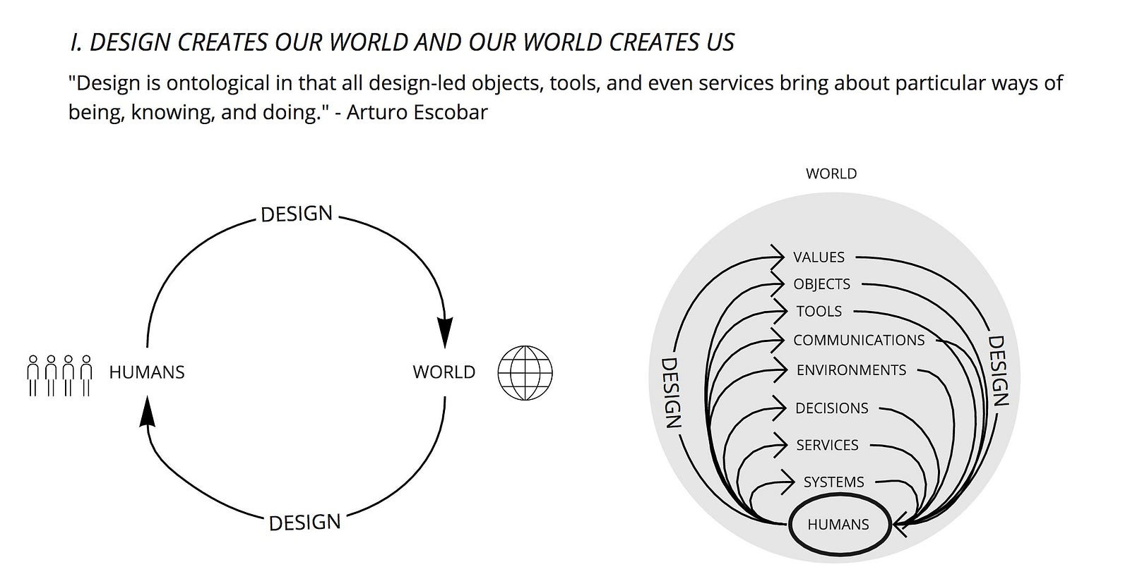 Elsewhere in the introduction, Escobar is setting up this idea of ontological design. He proposes that in this text he will discuss not merely the design of physical things of the material world or of the architectural metaphors of our organizations, but the design of our perspective. I have been personally obsessed with this notion for my entire life; the design of life as an intentional designing of one’s own orientation, reflexivity as a tool and an appendage, rather than as a framework imposed upon life. I would oppose this to the supremely modernist — or even high-modernist — utopian scheme of imposing our idealistic will upon the world. To design oneself from the core, from the middle out, to permeate through all of our contact with the world.