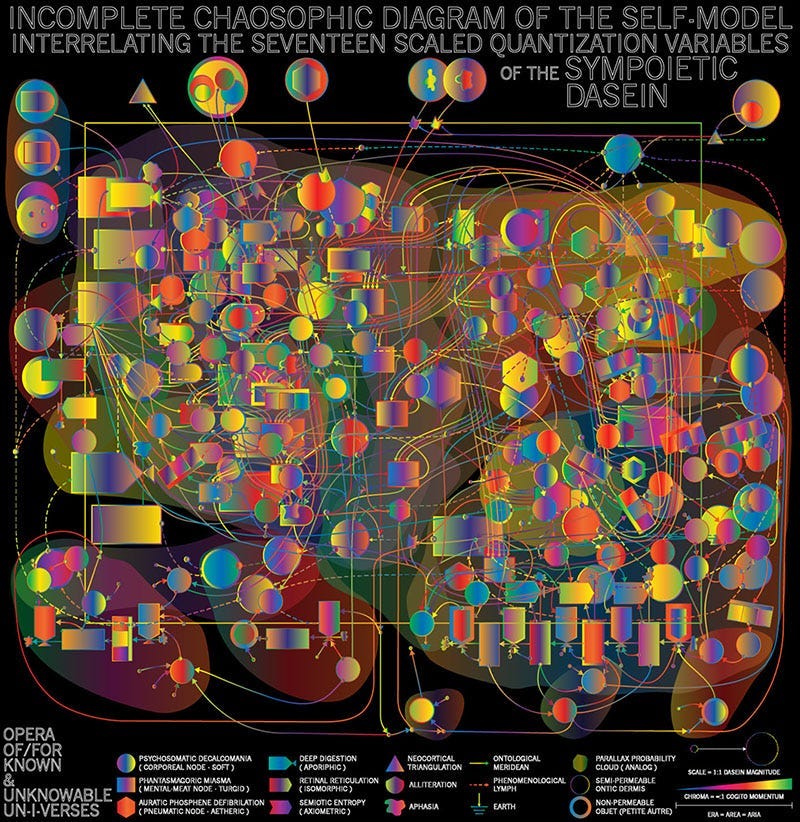 It’s almost like a stutter. Whether it’s a cultural stutter or a neurological stutter I’m not so sure, and what’s the difference anyways? If we’re thinking of ourselves in an expanded ecological network, as a networked self tethered to each other, are we stuttering on this notion because we don’t have the words? Is it a clumsiness like a jagged, percussive stuttering? To bring it back to the musical score, how do we notate the opportunity for the stutter so that we can embrace the clumsiness of the composition and somehow stir up a joyfulness in the collaboration? It really amounts to an encouragement to become more comfortable with the unknown and the unknowable. I’ve been meditating on this for many years. I have this half-baked opera written into the unknown and for the unknowable. This is also a meme within the tech culture. It’s almost spoken about in terms of Darwinian fitness, as in social Darwinism. Those that are the most fit and therefore the most efficient, the most likely to succeed, are those that are the most comfortable in dealing with the unknown, meaning the unexpected, but also just the unpredictable. This often amounts to a boldness, a fierceness, a blind courageousness when faced with the unknown, to plow into it rather belligerently. “Don’t let yourself be clumsy! Don’t trip! Continue to step boldly into that void!” That is a hubristic gesture, a belligerent gesture.